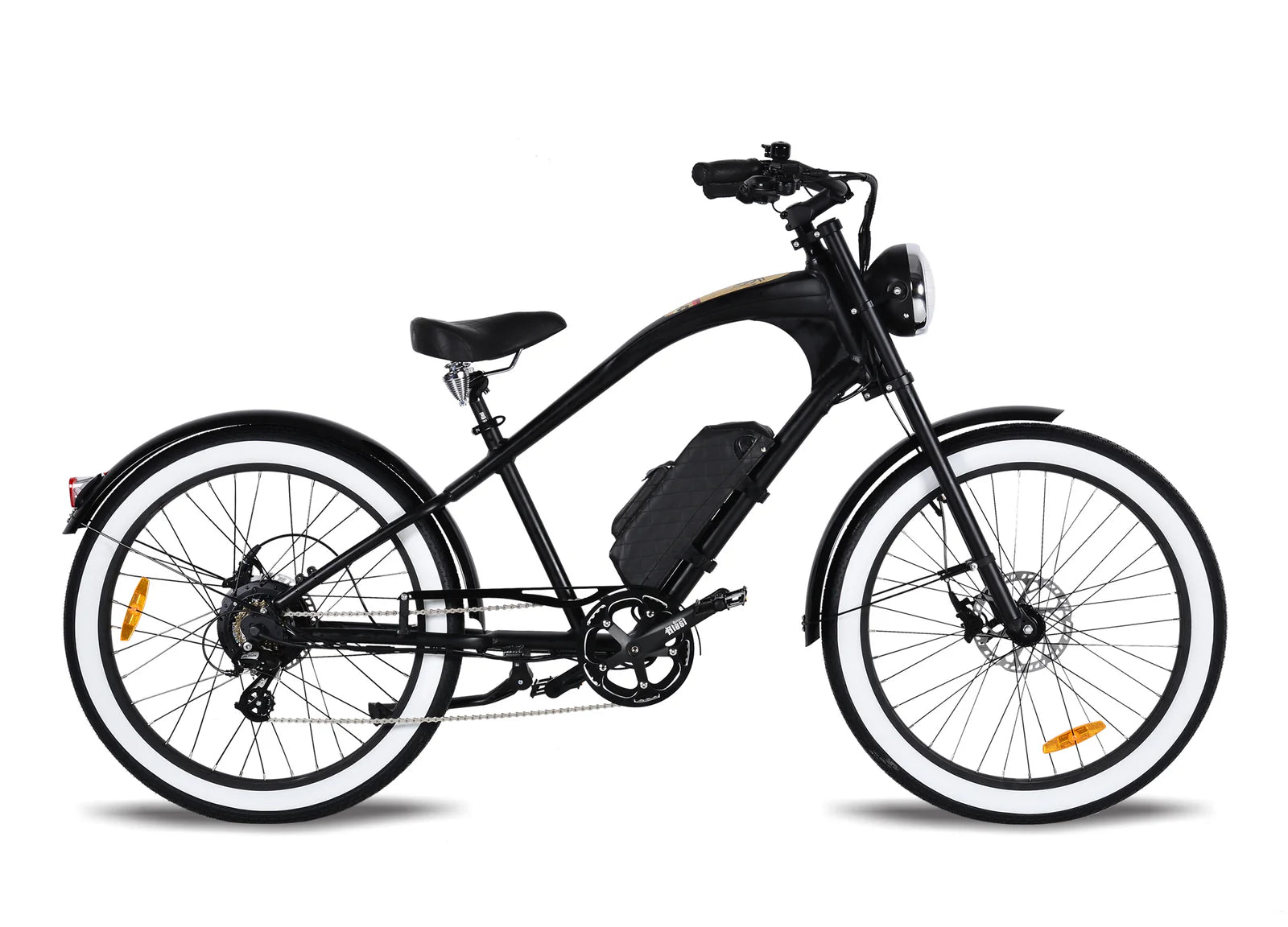 Embrace the freedom of the open road with the Vacay Hi-Step. This e-bike features a bobber-inspired frame, a big, bright headlight, and a comfortable extra-wide saddle. Its brilliant whitewall tires enhance the vintage look while providing a smooth ride. Powered by a 500W motor and a 48V 14.5Ah battery, the Vacay 500W offers a perfect blend of style and performance, making every ride a relaxing and enjoyable experience.