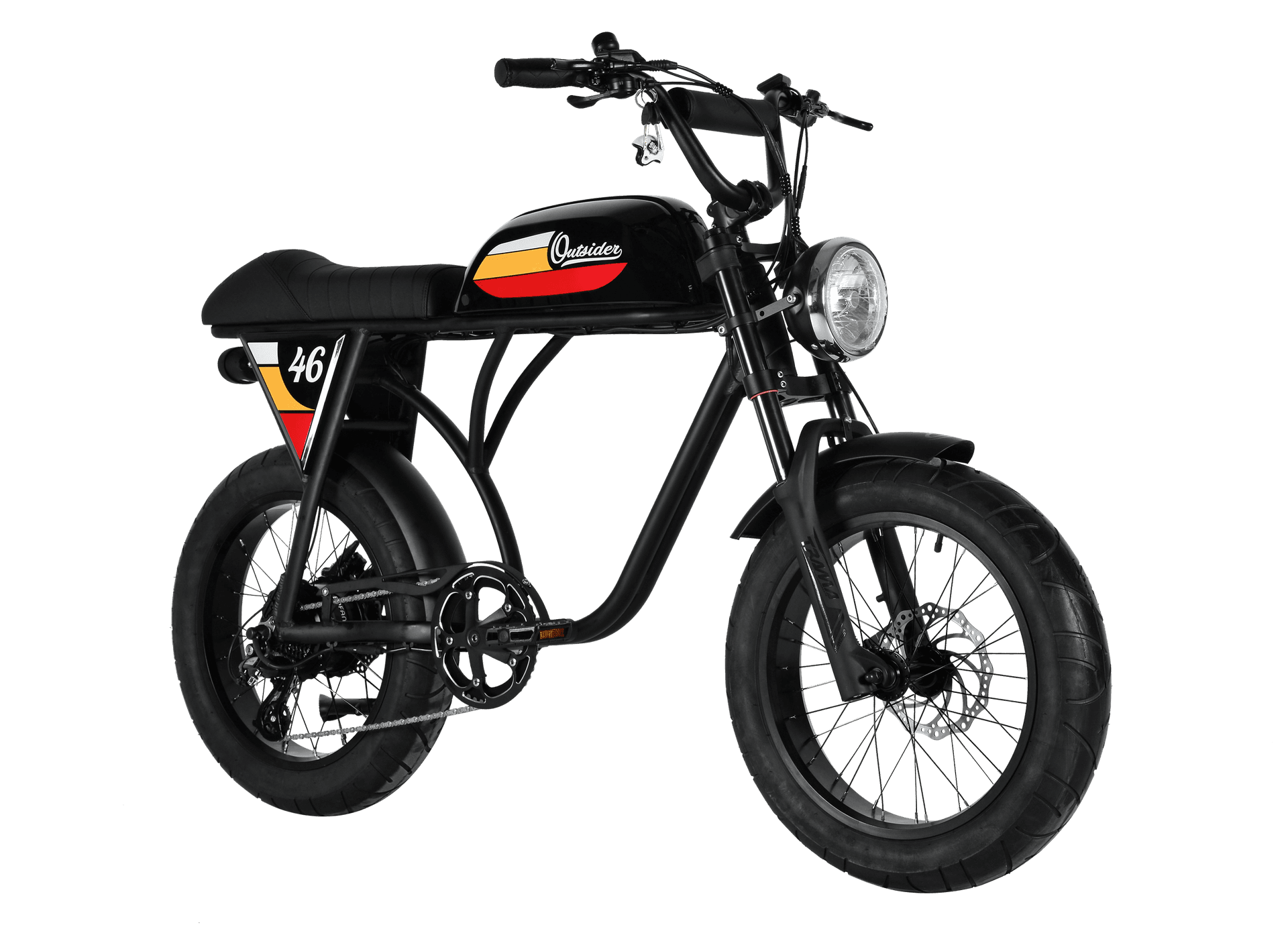 The scrambler was born in 1960s Britain — stripped-down motorcycles ripped off tarmac and turned onto dirt tracks. No boundaries. No rules. The Outsider carries that spirit into the electric age. It's the bike for riders who don't pick a lane. Wide handlebars. Knobby tires. An upright riding position that lets you take in every inch of the world you're riding through. Under the tank: a Bafang motor and Samsung battery that'll take you 60+ km on a single charge. Over the handlebars: whatever road you choose next.